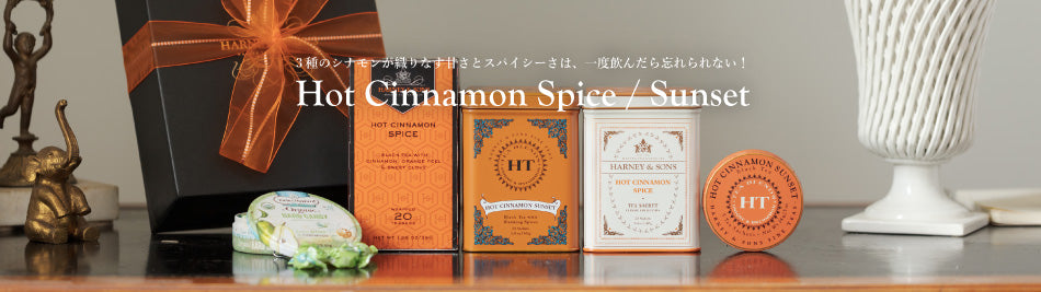 テイスティング Brisknessのどごし2 Bodyボディ 2 Aromaアロマ 5 カフェイン 有 ボディ ミディアムボディ 抽出時間 3分 100℃ 湯量 2gもしくは1サシェ250cc アロマ このお茶はスパイスと柑橘類の非常に強い香りがします。 フレーバー このお茶は、オレンジと天然シナモン、天然および人工のシナモン香料、クローブを組み合わせた、当店で最も風味豊かな(そして人気の)お茶の一つです。 原材料 紅茶(中国産)、オレンジピール、シナモン、クローブ/香料 ペアリング フロランタンなどナッツを使った焼菓子 HARNEY & SONSのシグネチャー・ブレンド" ホット・シナモン・スパイス " 上質な紅茶をベースに3種のシナモン、オレンジ・ピール、スイート・クローブをブレンドしたスパイスティーです。甘さとスパイシーさの2つの表情を持つ フレーバーティーは、お砂糖など甘味料は入っていないのに、とても甘くてスパイシーな味わいで初めて飲む方はびっくりするかも! その秘密は3種類のシナモンです。リキッド、パウダー、チップのシナモンをブレンドすることにより、唯一無二の味わいを作り出しています。 ストレートでも、お好みでミルクとあわせてチャイ風にアレンジしていただくのもおすすめです。シナモンの甘い香りと味わいをお楽しみください。 【原産国】アメリカ合衆国 【内容量】40g(2gx20個) (注)クラシックシリーズのホットシナモンスパイス、HTホットシナモンサンセット、HRPホットシナモンスパイス、50サシェ入りの3つの中身は変わりません。 お好みの缶でお買い求めください。 ☆"HOT...